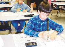 对学中文的美国学生来说,用毛笔写字非常新鲜有趣。图为乔州亚特兰大市书法比赛中,美国学童在写书法。(美国《世界日报》图)