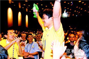 比赛结果宣布现场,当来自华中科技大学的陈志峰听到自己获得“IT架构”项目第一名时,激动地举着福娃欢呼上台。