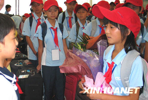 7月17日,赴俄罗斯疗养的364名四川地震灾区中小学生从北京、成都两地抵达俄罗斯符拉迪沃斯托克市,其中91名在北京首都机场乘坐国航包机的学生首批到达。疗养团的所有成员将入住符拉迪沃斯托克市的“海洋”全俄儿童中心,开始为期20天的疗养。 新华社记者 郑悦 摄