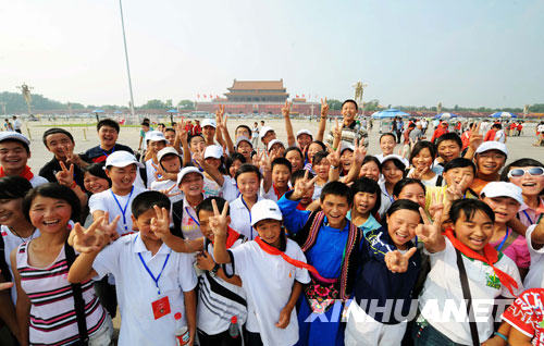 7月16日,学生在天安门广场合影。当天,部分赴俄罗斯疗养的地震灾区中小学生来到北京天安门广场参观。这批学生大约有100人,15日抵达北京,17日将前往俄罗斯。 新华社记者 王建华 摄