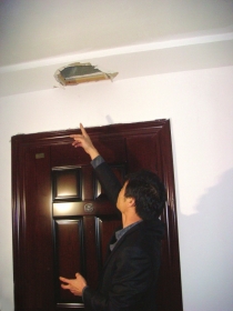 10月29日,小区物管介绍,朱玉掉落到架空层天花板上,并砸出一个洞。图/记者陈斌
