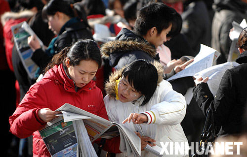 资料图片:2月16日,应聘者在春季招聘会上浏览招聘信息。 当日,北京春季大型人才招聘会在中国国际展览中心开幕。据悉,此次招聘会提供岗位2万余个,吸引数万求职者到场应聘。 新华社发 即日起,大中专毕业生只需登录市人事局毕业生就业网(www.bjbys.com),就可按学历、专业查询到各用人单位今年的空岗信息。昨天(2月18日),记者从北京市人事局大中专毕业生就业处获悉,市属单位的3.5万余条用人信息被集中上网公布给毕业生。