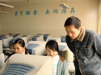在湖南省邵阳市隆回县万和实验学校计算机房,教师指导学生操作。摄影 王继怀
