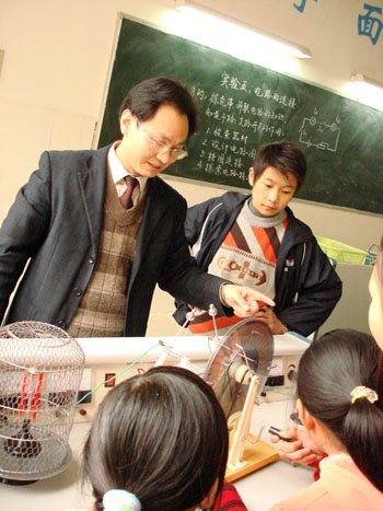 邵阳市民办学校教师辅导学生做实验。 摄影 王继怀