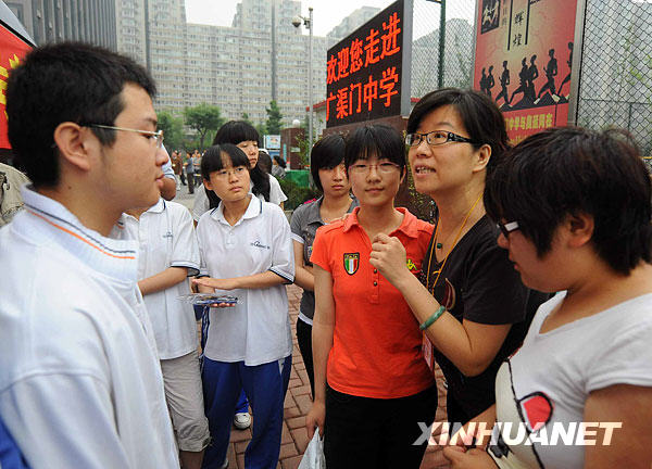 资料图片:6月7日,北京市广渠门中学宏志班的19名高考考生准备坐车向考点出发,老师在考生出发前祝大家考试顺利。当日,2009年全国普通高校招生全国统一考试开始进行。新华社记者罗晓光摄