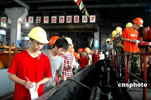 资料图片:2007年7月15日,中国矿业大学30多名选矿专业的大二学生来到安徽省淮北选煤厂参观实习,了解选煤生产工艺流程,检验学习成果,过一个充实而快乐的暑假。 中新社发 庞德胜 摄