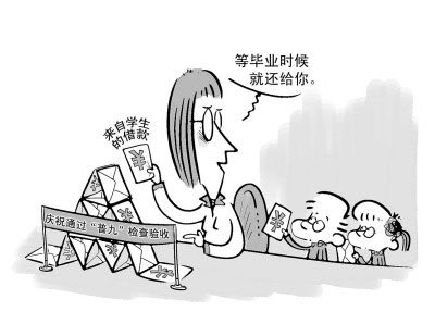 据李文韶介绍,1996年,为使梁园区通过省“普九”检查验收,当时向城区中小学在校生借款800多万元,给几所中小学建教学楼,顺利通过了省“普九”验收。从那一年开始,梁园区教育系统就开始年年借款还债,借“新生的钱还老生的账”,一直持续到今天。目前“普九”欠款还有700多万元,每年向城区小学一年级、初中一年级新生借些钱,区财政再给补贴点,然后还毕业生的钱。
