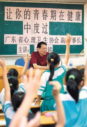 广东省心理卫生协会副理事长朱嘉铭来到海珠区卫国尧小学,给五六年级的女生们进行青春期性知识讲座。 (资料图片)