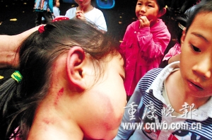 昨日下午,记者在重庆师范大学幼儿园见到了摇摇。记者看到,她右耳朵明显肿大,双手手臂也可见到多处瘀伤。摇摇的爷爷陈大爷站在旁边不断摇头叹气。他说,在摇摇颈部和背部,也有多处皮带抽出的瘀伤。