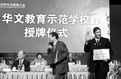 10月20日,首届世界华文教育大会上,海外校方代表接受“华文教育示范学校”授牌。