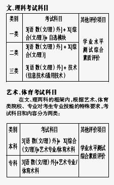 等,“方案”在四大分类及高中全科会考基础上,继续坚持以文、理两大科类为主线,以“语文、数学、外语”三门课程为主体,根据高中新课改实际和各类高校人才培养目标的不同需要,分三类设置考试科目。