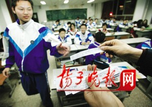 在经过近20天的热切等待后,昨天晚上7点左右,金陵中学河西分校高二的学生第一时间从班主任手中领到了用A、B、C、D不同等级记分的成绩通知单。记者在现场发现,面对不同的成绩,有人喜笑颜开,有人则难过地把头埋在了书堆里。“4个A!”心情很好的程同学得意地展示自己的成绩单。他把自己成功的原因归结为两点:一是去年小高考很多人都栽在了政治上,自己的政治也一向不好,因此就在政治上狠下了工夫,该背的该理解的都没有落下;二是他觉得今年文科考题确实偏简单。不过考了3A1B的小康拿到成绩单后却很失落。“今年考试一没想到物理化学这么难,二没想到自己的强项化学居然只拿了B。”不过难过归难过,康同学说没有4A已经是既定事实了,下面要把重点放在另外五门上。不过记者发现,对于定位于过关性考试的小高考,这次有学科没过关的学生压力是非常大的。一位姓吴的同学就栽在了生物上。“我心里很不好受,别的同学现在开始就可以全心备战高考了,而自己还要参加明年的生物补考。”
