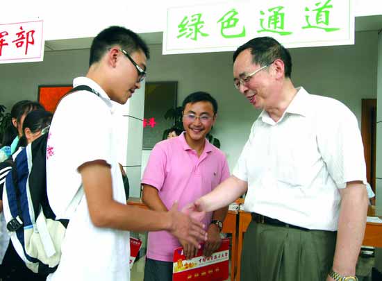 正在王德鑫和王刚填写表格的过程中,中科大校长朱清时院士来到了他们身边,“欢迎你们来到中科大!”校长向他们伸出了温暖的大手。听说王德鑫和王刚早早就立志考科大,朱校长高兴地说,“我也是四川人,也是早早立志考科大,我是1963年考上的,到现在45年了。”在了解到王德鑫是一个人来报到时,朱校长连声夸赞他“了不起”,“现在一个人来报到的学生可不多了,当年,我们都是一个人来学校的!”在向两位同学简单介绍了“绿色通道”的报名程序后,校长再次祝福他们:“祝愿你们在中科大的生活和学习一切顺利!”