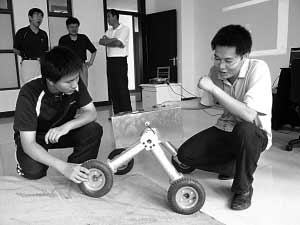 8月1日,刘峰(左)在中国矿业大学机器人研制室听取技术人员的讲解。戚庆燕 摄