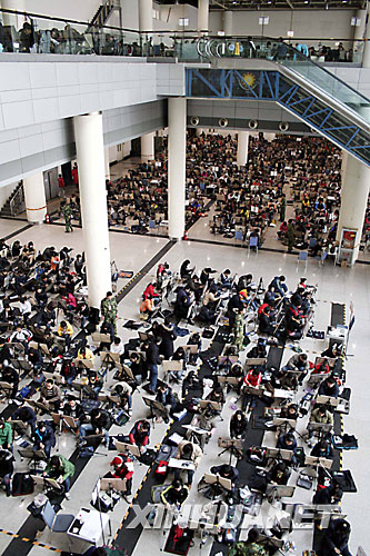 资料图片:艺考大军蔚为壮观。2008年2月20日,“艺考”考生在济南舜耕会展中心展览大厅参加考试。当日,山东省工艺美术学院将考场搬进了2万多平方米的济南市舜耕会展中心,7000多名美术类专业考生在这里参加考试。2008年山东报名参加普通高校艺术招生的人数达到16.1万。 新华社记者 范长国摄