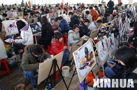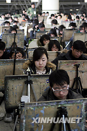 资料图片:2月20日,“艺考”考生在济南舜耕会展中心展览大厅参加考试。当日,山东省工艺美术学院将考场搬进了2万多平方米的济南市舜耕会展中心,7000多名美术类专业考生在这里参加考试。2008年山东报名参加普通高校艺术招生的人数达到16.1万。 新华社记者 范长国摄