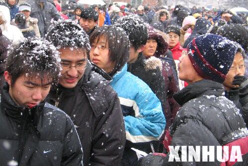 艺考大军蔚为壮观,考生们冒雪参加“艺考”报名。