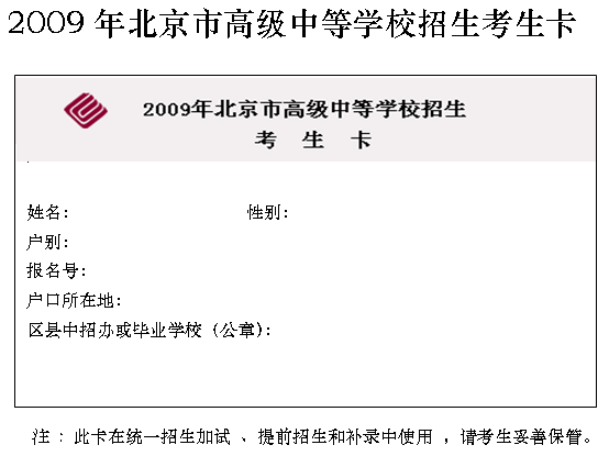 1、2009年北京市高级中等学校招生考生卡