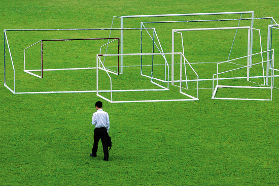 最后的招聘会颇冷清。求职大学生经过会场中间堆放着的足球门架 记者 何奔 摄