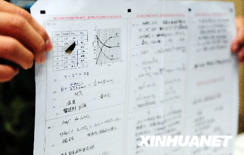 考生宋朔被抢的理科综合试卷的破损处(6月17日摄)。吉林省高考成绩21日公布,松原市高考期间试卷被抢考生宋朔的试卷顺利通过机器评阅,获得了总成绩566分的高分,其中被抢的理科综合试卷成绩为228分。今年高考期间,吉林省松原市吉林油田高中考生宋朔在理科综合考试临近结束2到3分钟时,试卷被同考场考生杨某扯拽,虽被监考教师制止,但宋朔的答题卡受损,答题卡右上角距边缘2至3厘米出现食指大小的洞。 新华社记者王昊飞摄
