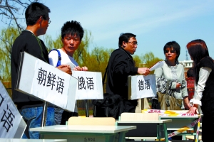 资料图片:2009年4月5日,第二外国语学院小语种开始报名招生,引来许多学生和家长。图片来源:新京报 秦斌 摄
