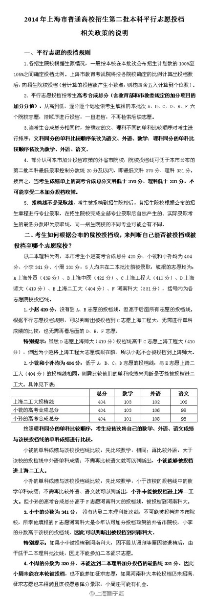 2014年上海高考本科二批平行志愿投档相关政策说明