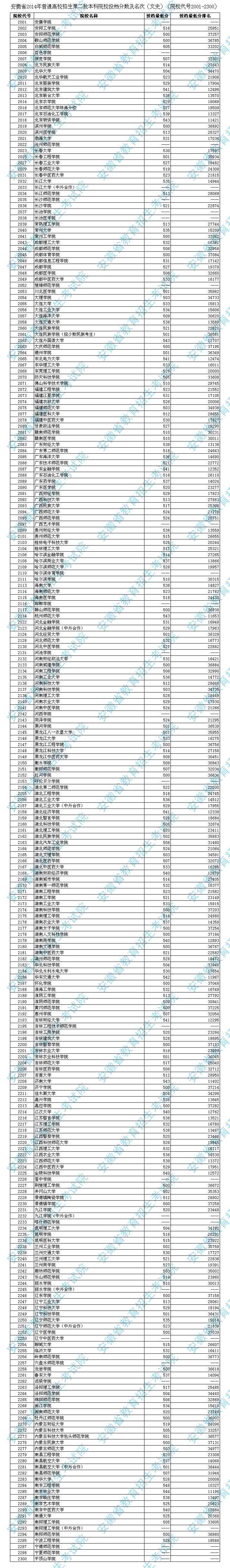 2014年安徽二本院校投档分数(文史)院校代号2001-2300