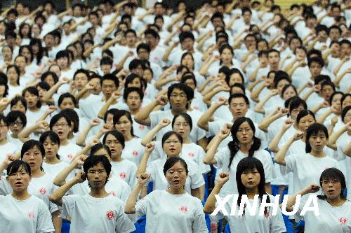 资料图片:2008年7月15日,“资教生”在培训班结业典礼上集体宣誓。当天,湖北省“农村教师资助行动计划”岗前培训班结业典礼在湖北经济学院举行,从全国范围内选招的2600余名普通高校本科毕业生完成了专业培训,将赴湖北省乡镇农村学校进行为期3年的任教工作。“农村教师资助行动计划”自2004年实施以来,湖北省已选招6107名来自全国99所高校的大学生(“资教生”)到1200多个乡镇学校任教。杨宏斌 摄