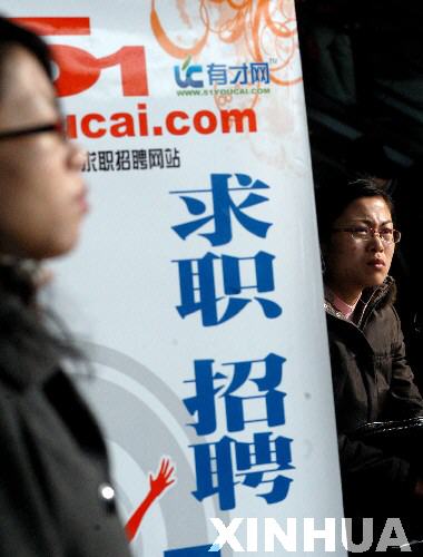 资料图片:2008年12月7日,在山东大学2009届毕业生就业供需见面会现场,求职者从招聘海报前走过。(赵晓明 摄)