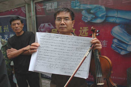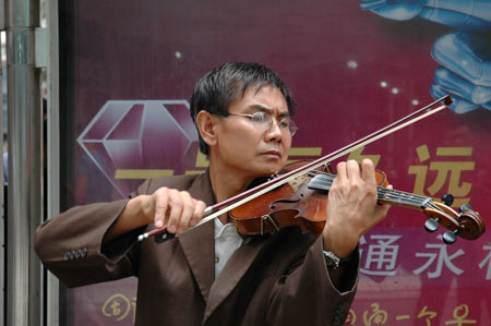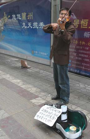 (本报记者 金奉乾 郭胜军) 8月28日上午,在城关区皋兰路北端的人行道上,一个戴眼镜的中年男子正在拉小提琴,动听的旋律吸引了许多路人围观。 他面前的地上放着一个铁桶,里面零零星星放着几张一元面额钞票。在与他的搭讪中,记者了解到,这个表情严肃的“演奏家”,原来是皋兰县西岔镇附近的首钢胜利机械厂技校的数学老师。