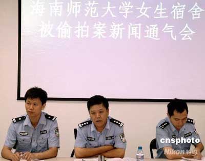 海口市公安局七月二日上午在此间举行通报会,海南师范大学女生宿舍被偷拍事件告破,该校大一男生陈某供认出于好奇偷拍女生宿舍,并将其中三百张照片上传网络。他因涉嫌违反《中华人民共和国治安管理处罚法》,获行政拘留十日的处罚。图为海口市公安局网监处李燃处长称,陈某所拍照片中没有淫秽内容。中新社发王辛莉摄
