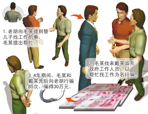 毛某打包票:“我老表在政府工作,他和领导关系好,可以帮你儿子找工作,就说是我侄儿。”老胡夫妇很高兴,马上交换了电话。