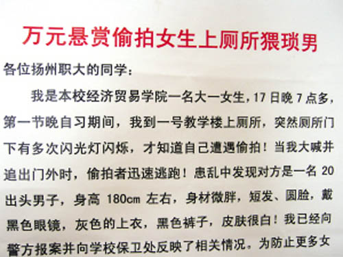 18日,一张张名为《万元悬赏偷拍女生上厕所的猥琐男》的“悬赏启事”,张贴在了扬州职业大学校园内,吸引了该校师生的注意。记者看到,“悬赏启事”标题的字体和颜色都格外醒目,内容为一位大一女生遭遇偷拍的经历。“我是本校经济贸易学院一名大一女生,17日晚7点多,第一节晚自习期间,我到一号教学楼上厕所,突然厕所门下有多次闪光灯闪烁,才知道自己遭遇偷拍!……我已经向警方报案并向学校保卫处反映了相关情况。为防止更多女生受侵害,早日将这种性变态的人绳之以法,我个人出10000元悬赏知情人提供有价值线索。”记者注意到,“10000元”的字体很大,而且是红颜色,格外惹眼。启事最后还写着“捍卫女生权益,和偷拍斗争到底”的字样。