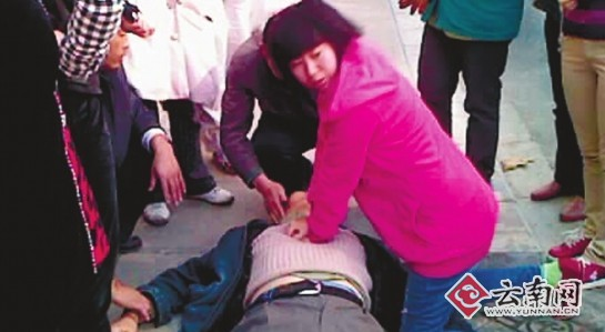 昨天上午,在昆明市环城南路,一位七旬老人突然倒地不省人事,众多途经此地的好心人纷纷伸出援手。其中,一名穿紫红色外衣的年轻女孩,多次为老人做胸外心脏按压及人工呼吸,用尽了力气。这感人的一幕被一位过路市民拍摄了下来。