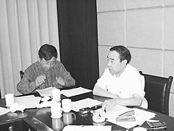 平凹(右)和余秋雨(左)正在为评选作最后的协商。韩志英摄
