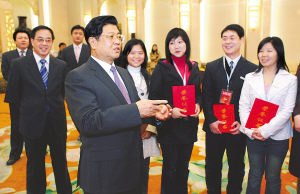 照片:由共青团中央、全国学联主办的首届“中国大学生自强奖学金”颁奖座谈会,1月19日上午在北京人民大会堂举行。中共中央政治局委员、全国人大常委会副委员长王兆国会见获奖学生代表,并为10名特等奖获得者颁奖。图为王兆国与获奖学生代表亲切交谈。本报记者 李建泉摄
