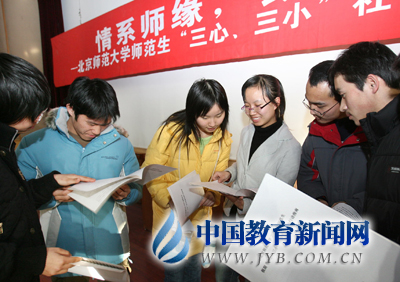 本报讯(记者 徐维彬)为做好免费师范生的思想政治教育工作,北京师范大学日前推出“三小、三心”专题假期社会实践活动。免费师范生通过小调查、小助学、小议政“三小”活动,向社会表达和传递免费师范生的爱心、责任心和感恩心。