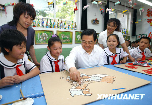 这是胡锦涛同正在上手工课的小学生一起用蛋壳粘贴中国地图。新华社记者兰红光摄