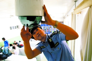 6月2日,团结湖三中,朝阳警方开始检查高考考场的监控器。当天起,朝阳警方对辖区17所高考考点校的监控设施及周边环境等进行安全大检查。据朝阳公安分局内保处副处长乔建文介绍,针对高考考点的安全检查需保证在周五前完成。其间,警方需对各考场电视监控探头、学校监控中心(中控室)及考场外通报信息的电子屏幕进行检查。从现在起,监控探头将24小时不间断试运行。记者 韩萌 刘洋 摄影报道