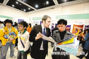资料图片:往届国际教育展上,学生咨询国外高校情况。记者 史宗伟 摄