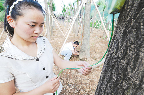 7月9日,陕西省凤县的大学生村官在精心呵护刚栽植的观赏树木。去年9月,陕西省宝鸡市从2630名大学生中遴选出156人担任村支书、村主任助理。 段达明摄