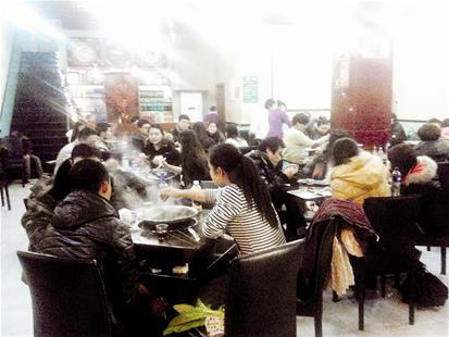 图为:昨晚11时许,汉口铭新街一餐馆食客爆满。记者采访多人,他们都对“末日”说一笑置之。 记者乐毅摄