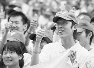 2007年9月16日,在王府井街头,北京地区志愿者手持笑脸道具,大声宣读《与志愿者同行·向世界说你好》的倡议书。(苏冠名 摄)