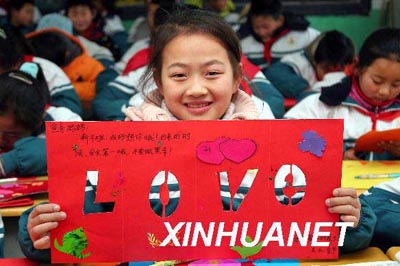 资料图片:2008年1月21日,一名留守儿童展示自己制作的亲情平安贺卡。当日,江苏省连云港市灌南县光明实验学校开展以“自制亲情贺卡寄平安”为主题的交通安全教育活动。全校1600多名留守儿童在教师指导下制作亲情平安贺卡,为父母送去新春平安的祝福。新华社发(穆道勇 摄)