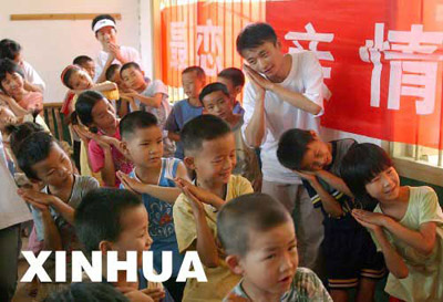 资料图片:在湖南省郴州市嘉禾县钟水乡坦塘村,大学生在教留守儿童表演手语歌《感恩的心》(2007年7月17日摄)。