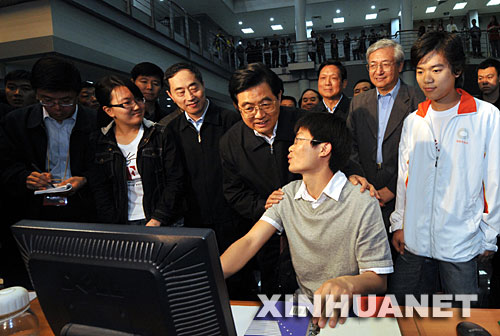 5月3日,在北京大学建校110周年之际,中共中央总书记、国家主席胡锦涛来到北京大学考察。这是胡锦涛在学校图书馆了解学生上网检索资料的情况。 新华社记者 樊如钧 摄