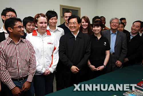 5月3日,在北京大学建校110周年之际,中共中央总书记、国家主席胡锦涛来到北京大学考察。图为胡锦涛在学生宿舍楼同部分外国留学生亲切交谈。 新华社记者 鞠鹏 摄
