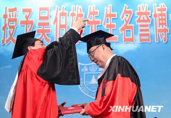 5月31日,南京大学授予吴伯雄法学名誉博士学位,南京大学校长、校学位评定委员会主任陈骏(左)向吴伯雄颁授学位证书。