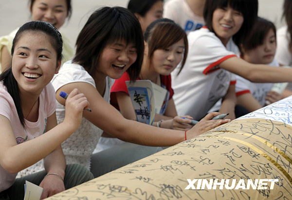 5月30日,淮北卫生学校的学生在巨型“香烟”上签名,号召远离烟草。
