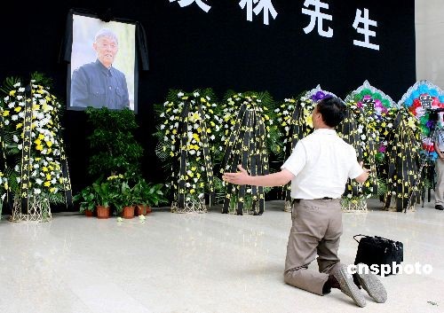 国务院新闻办五洲传播中心研究员张敏走进灵堂,跪倒在地,向季羡林的遗像深情叩首,并含泪朗诵:“举世闻名学问深,毕生研究东语文。太平洋水千万里,不及季老教我恩。”